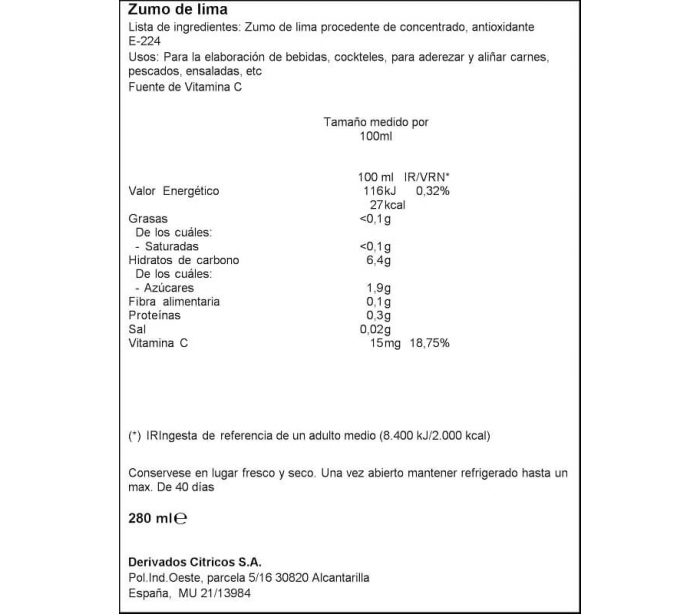 ADEREZO LIMA EXPRIMIDA LIMASOL 280 ML.
