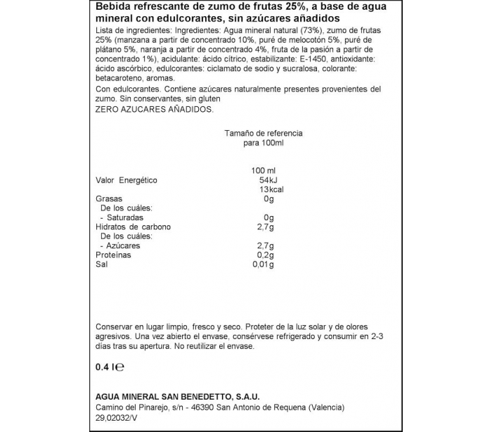AGUA MINERAL NATURAL ZUMO FRUTA MIX SAN BENEDETTO 0,4 L.PET