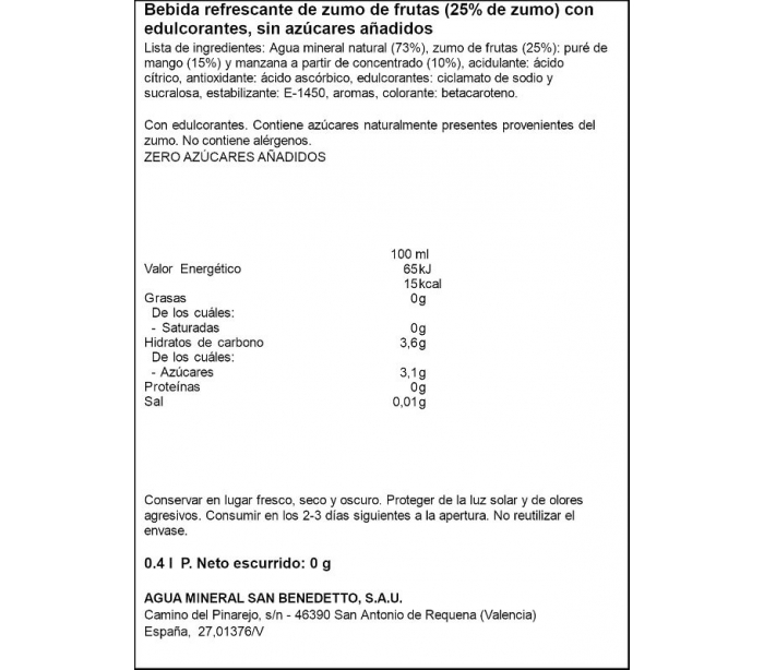 AGUA MINERAL NATURAL ZUMO MANGO Y MANZANA SAN BENEDETTO 0,40 L.PET