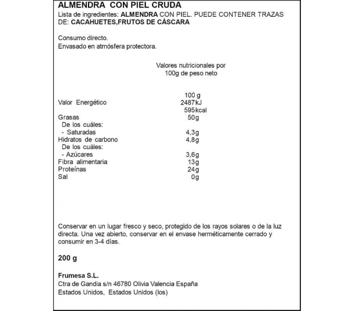 ALMENDRA NATURAL CON PIEL ALTEZA 200 GR.