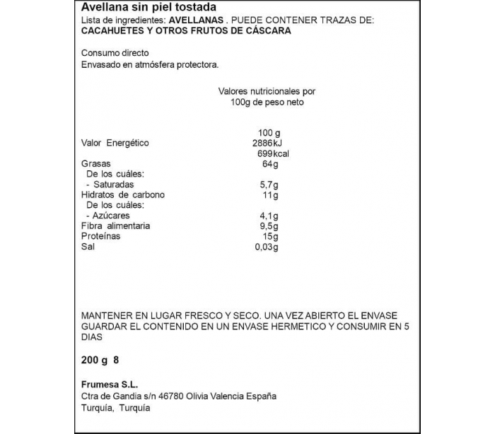 AVELLANA TOSTADA S/SAL ALTEZA 200 GR.