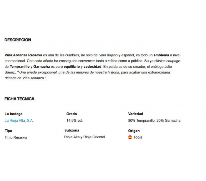 VINO TINTO RESERVA VIÑA ARDANZA 75 CL.