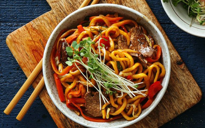 Fideos orientales, pechuga de pollo o tofu, zanahoria, pimiento, cebolla, salsa de soja, aceite de oliva, especias.