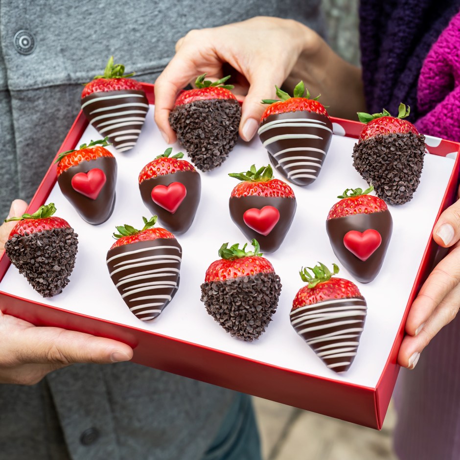 Caja de corazones: fresas cubiertas de chocolate decoradas con coco rallado, chispas de chocolate, avellanas, sprinkles, chocolate belga blanco y rosado.