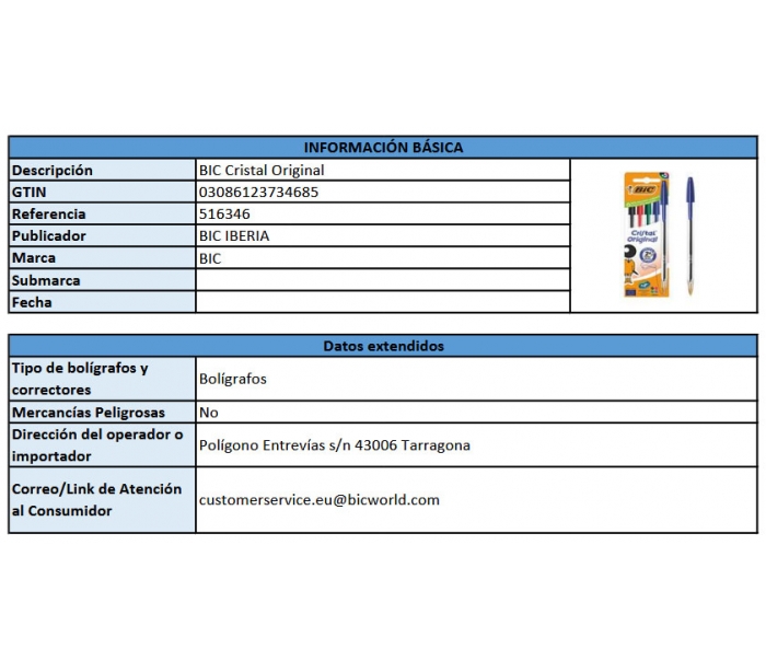 BOLIGRAFO CRISTAL ORIGINAL SURTIDO BIC 5 UN.