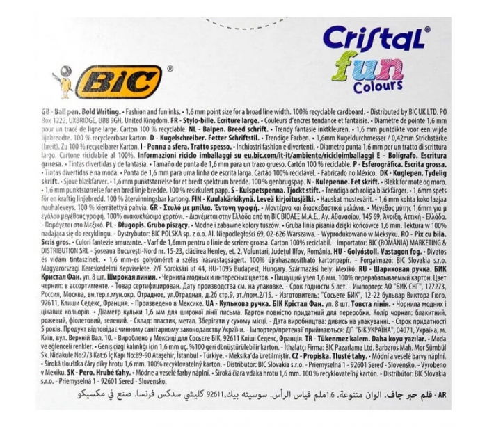 BOLIGRAFO CRISTAL FUN COLOURS BIC 6+2 UN.