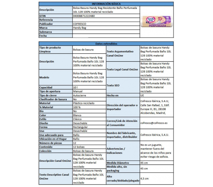 BOLSA BASURA BAÑO 10L. HANDY BAG 12 UN.