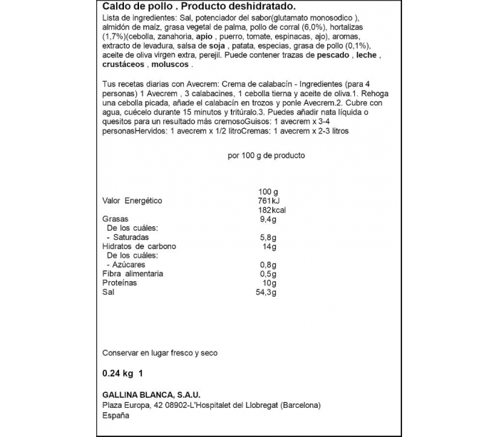 CALDO AVECREM POLLO+CUCHILLO GALLINA BLANCA 24 PASTILLAS.240 GR.