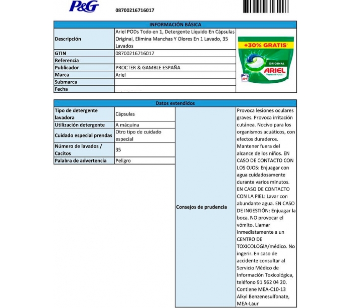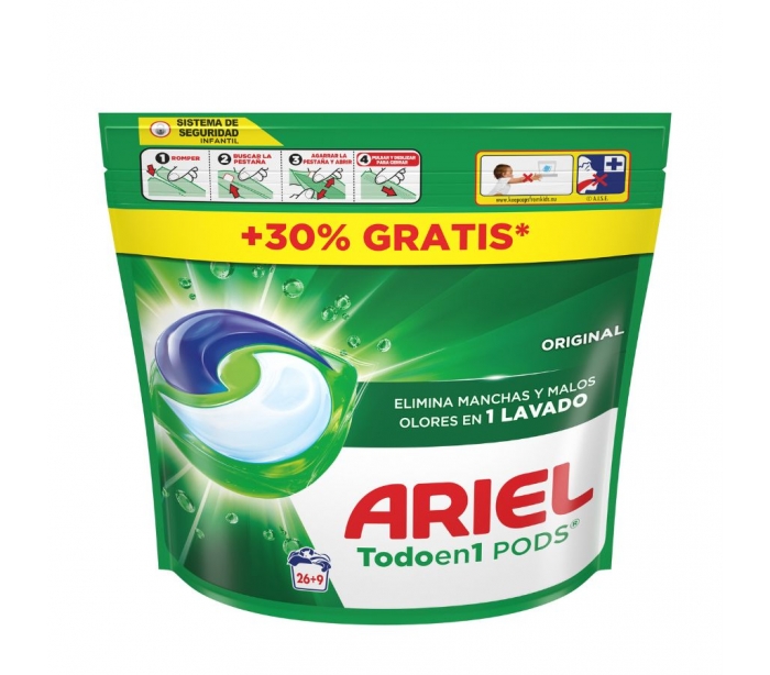 DETERGENTE CÁPSULAS ORIGINAL ARIEL 665 GR.26+9 CAPSULAS GRATIS