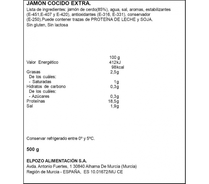 JAMON COCIDO EXTRA LONCHAS ALMIREZ 500 GR.