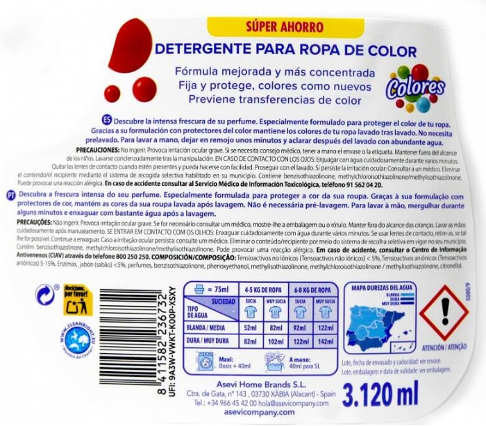 DETERGENTE LÍQUIDO CONCENTRADO COLORES ASEVI 3.120 ML.