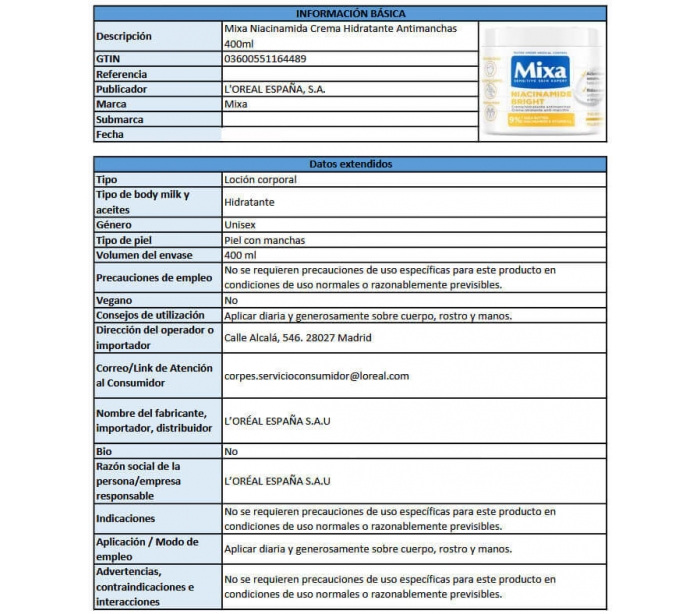 CREMA HIDRATANTE ANTIMANCHAS MIXA 400 ML.