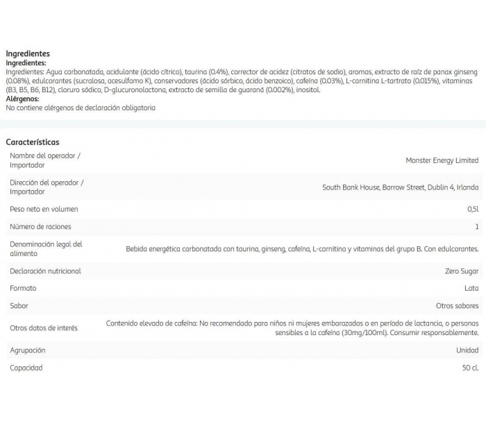 BEBIDA ENERGETICA WHITE ZERO MONSTER 500 ML.