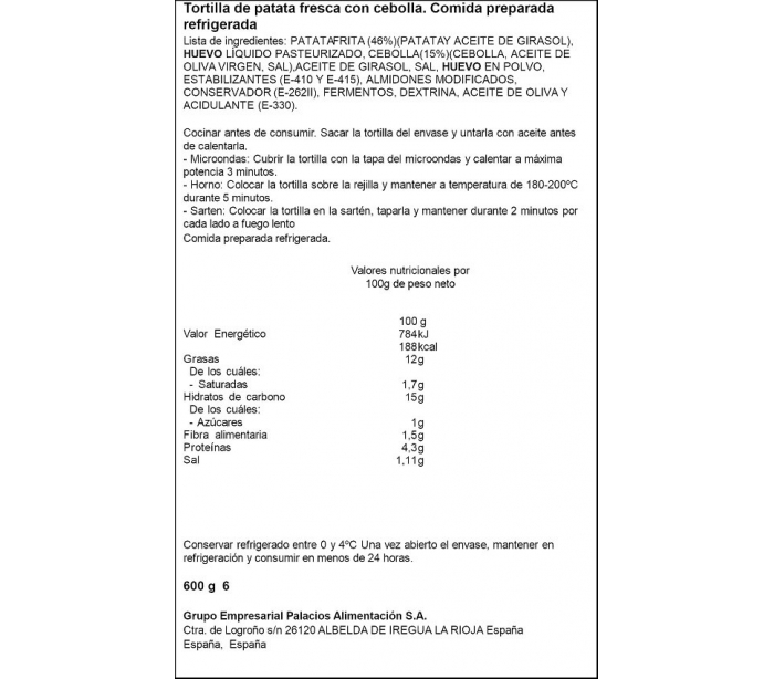TORTILLA ESPAÑOLA CON CEBOLLA . 600 GR.