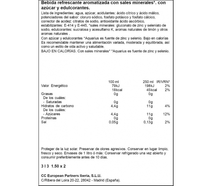 BEBIDA ISOTONICA LIMON AQUARIUS PACK 2X1,5 L.