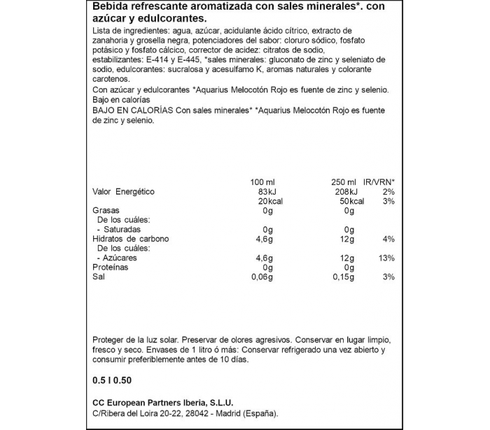 BEBIDAS ISOTÓNICAS MELOCOTÓN ROJO AQUARIUS 500 ML.PET