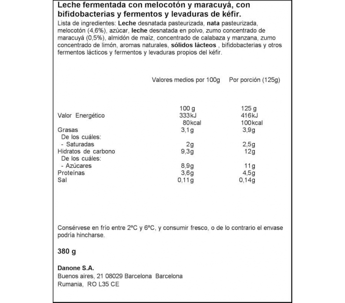 KÉFIR MELOCOTÓN Y MARACUYÁ ACTIVIA 380 GR.