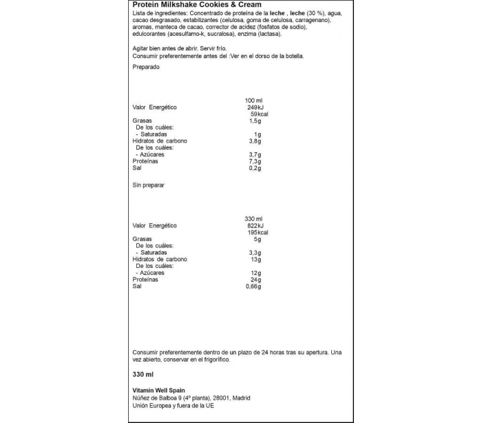 BATIDO COOKIES&CREAM PROTEIN BAREBELLS 330 ML.