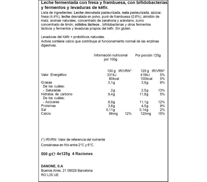 KEFIR FRESA Y FRAMBUESA ACTIVIA PACK 4X125 GR.
