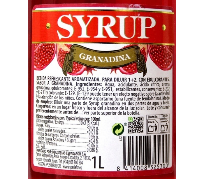 LICOR SIN ALCOHOL GRANADINA SYRUP 1 L.
