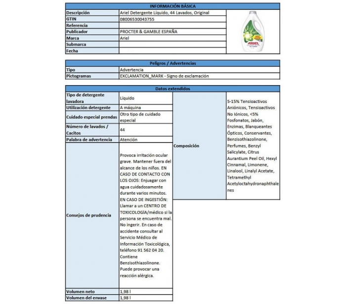 DETERGENTE LIQUIDO ORIGINAL ARIEL 1.980 ML.28+16 DOSIS GRATIS