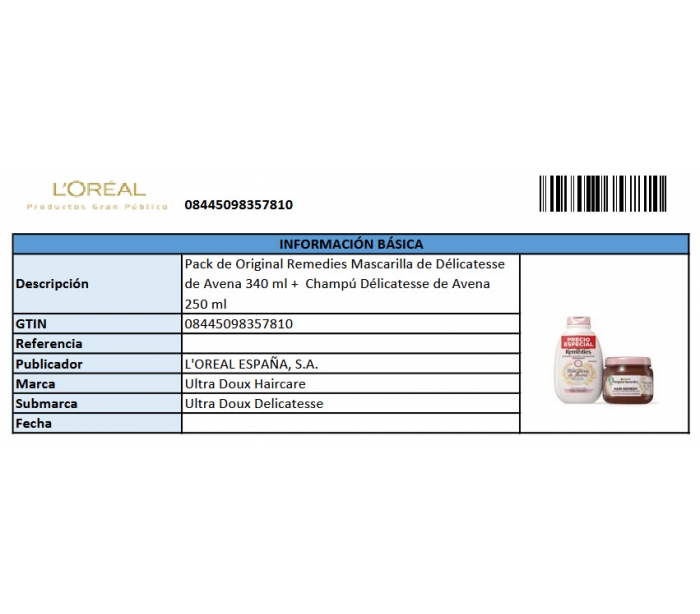 MASCARILLA DELICATESSE AVENA+CHAMPÚ ELVIVE 340+250 ML.