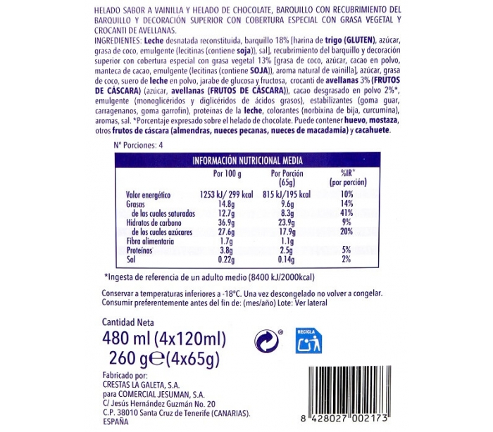HELADO CONOS VAINILLA CHOCO TAMARINDO PACK 4X125 ML.