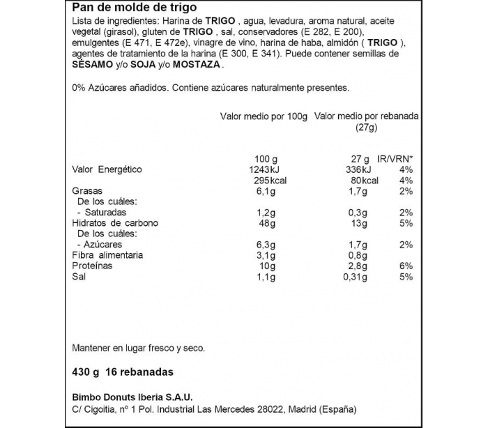 PAN DE MOLDE BLANCO BIMBO 430 GR.