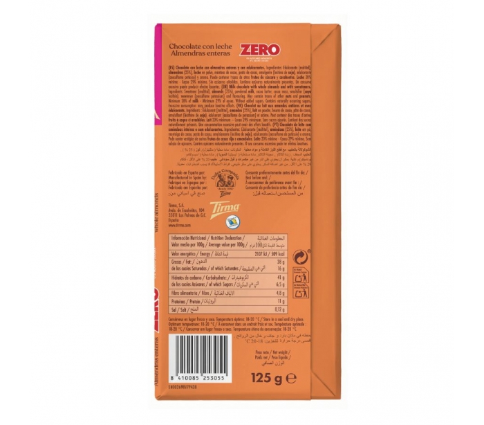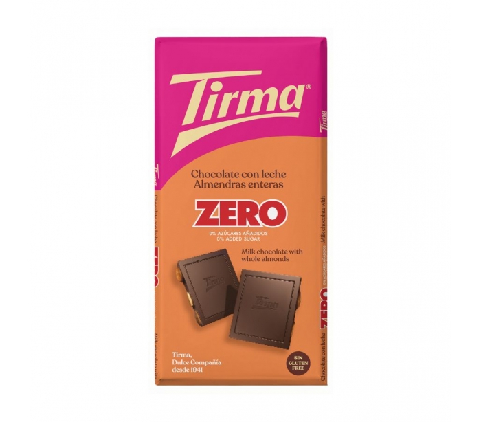 CHOCOLATE CON LECHE Y ALMENDRAS ENTERAS SIN AZUCARES TIRMA 125 GR.