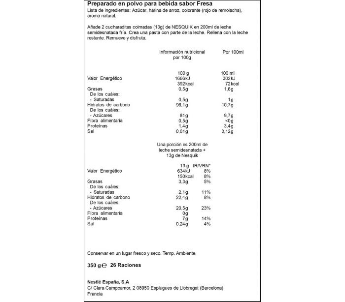 CACAO SOLUBLE FRESA NESQUIK 350 GR.BOLSA