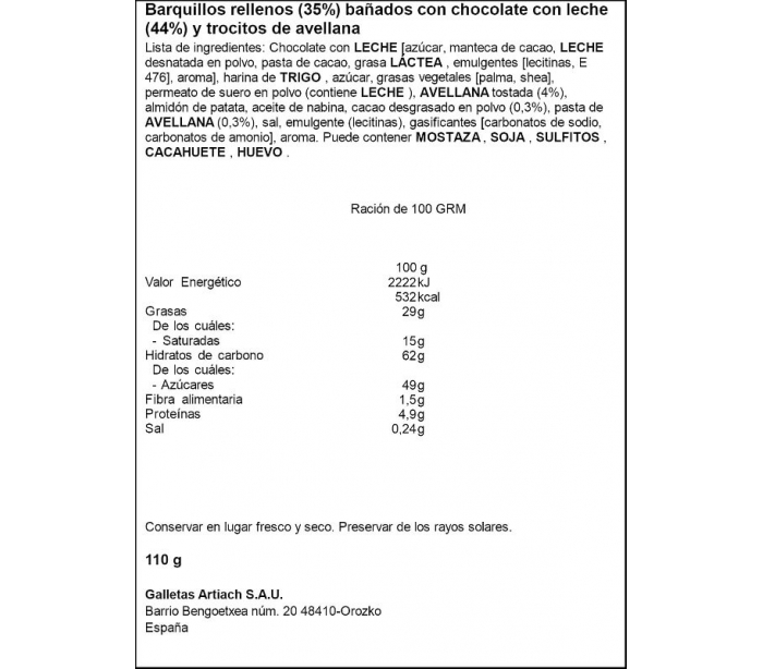 GALLETA BARQUILLO MINI AVELLANA ARTIACH 110 GR.