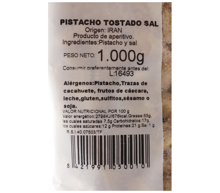 PISTACHO IRANI TOSTADO SAL CASA RICARDO 1.000 GR.