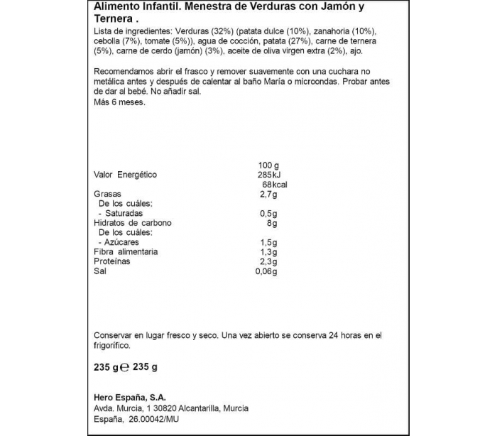 COMPOTA MENESTRA VERDURAS CON TERNERA HERO BABY 235 GR.