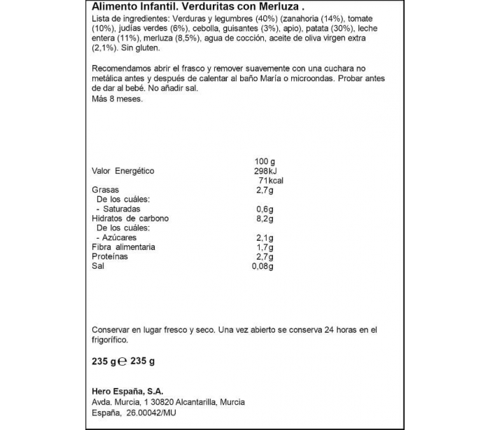 COMPOTA VERDURITAS CON MERLUZA HERO BABY 235 GR.