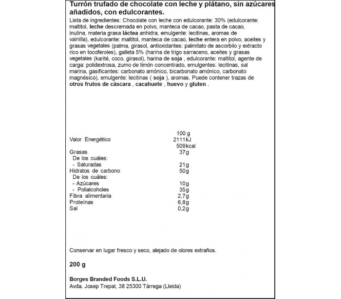 TURRÓN SIN AZÚCAR CHOCOLATE CON PLÁTANO VIRGINIAS 200 GR.