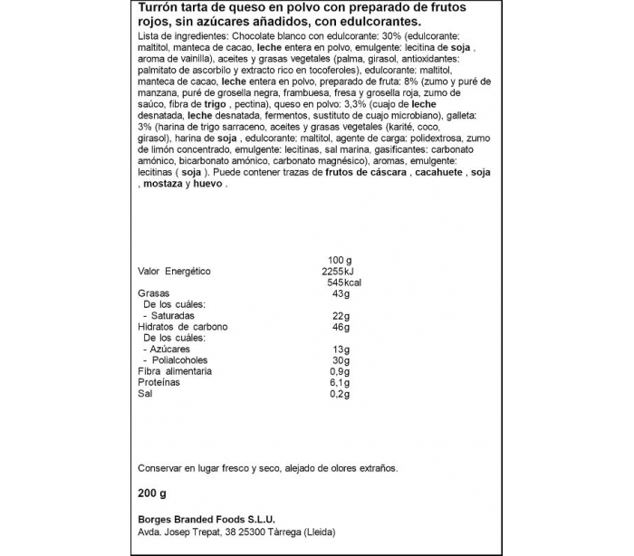 TURRÓN SIN AZÚCAR TARTA DE QUESO CON FRAMBUESA VIRGINIAS 200 GR.
