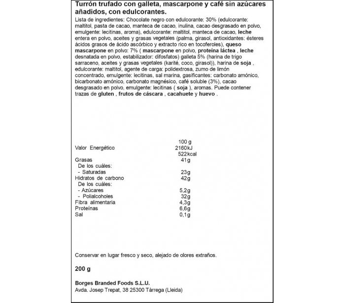 TURRÓN SIN AZÚCAR TIRAMISÚ VIRGINIAS 200 GR.