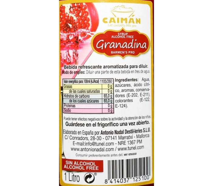 LICOR SIN ALCOHOL GRANADINA CAIMÁN 1 L.