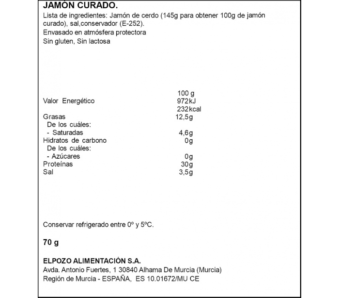 JAMON CURADO REDUCIDO EN SAL EL POZO 70 GR.