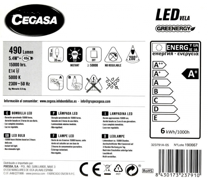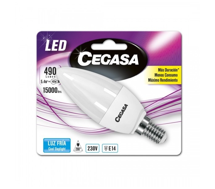 BOMBILLO LED VELA 5,4W.E14 FRIA CEGASA 1 UN.