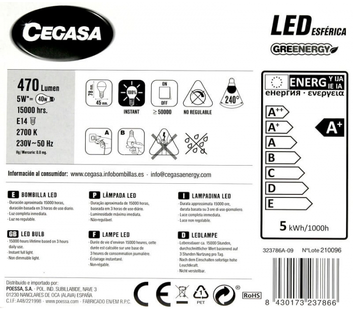 BOMBILLO LED ESFERICA 5,4W.E14 CALIDA CEGASA 1 UN.