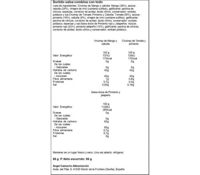 SALSAS JALAPEÑO/MANGO CEBOLLA/TOMATE LA VIEJA FABRICA PACK 3 UN.86 GR.